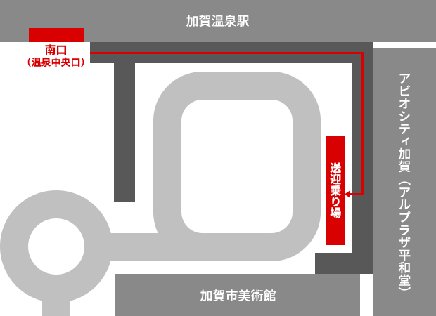 加賀温泉駅南口(温泉中央口)から出て、ロータリーをアビオシティ加賀方面にお進みください。