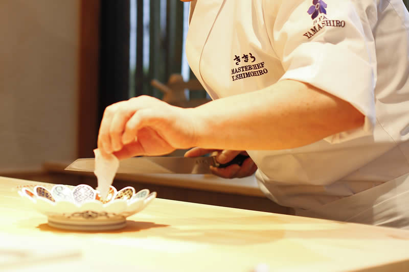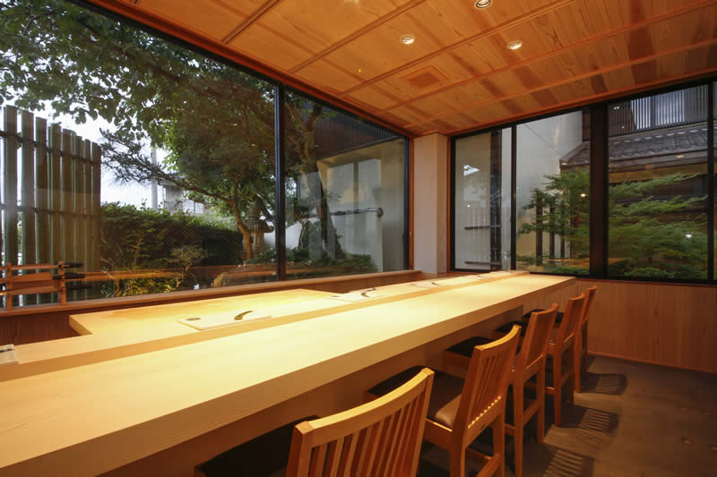 お客様と料理人が食材を挟んで向かい合い、気軽に語り合える場所はカウンターしかない。旅館の料理人はどれほど腕を振るっておいしい料理を作ったとしても、お客様の喜ぶ顔を直接見る機会はほとんどない。カウンターなら自分の包丁さばきにお客様が見とれたり、心を込めて作った料理を目の前で味わってくれる。地元漁港から仕入れた食材はその日一番おいしい食べ方で最高の味を提供いたします。 大切な人と大切なひと時を過ごして欲しいという思いを込めて作られたこだわりのカウンターは、圧倒的な人気席であり、つい時間を忘れてしまうほどの居心地の良さがあります。