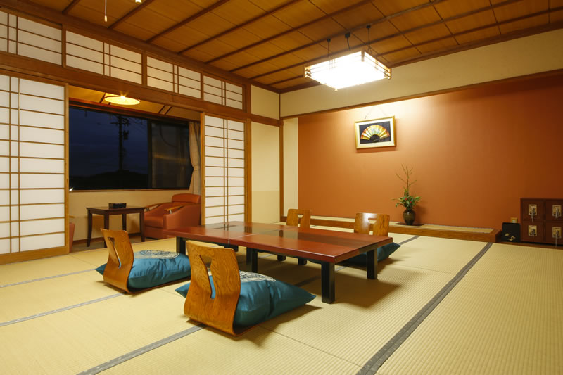 A special room "Tsukiraku" based on the large communal bath "Kuro". A luxurious and spacious space with a Japanese-style room of 10 tatami mats, a twin bedroom, and a semi-open-air bath. Please use it for loved ones, family trips, etc. The chef cooks meals in the special room by himself. Please enjoy the special dishes woven by skilled techniques.