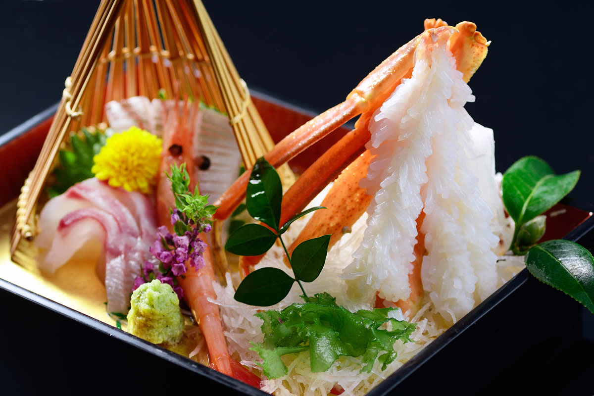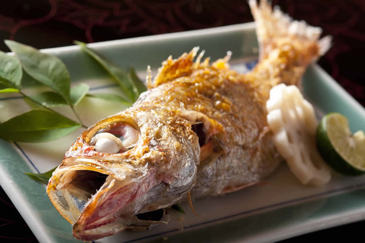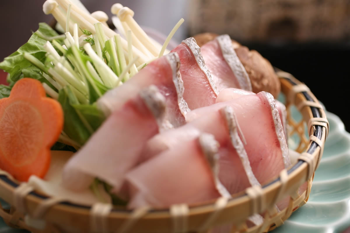 도미는 천연 토종만을 사용. 동해의 거센 파도에 휩쓸 천연 참돔은 몸이 잘 잠그고 맛도 꽉 응축 된 최고급의 맛입니다. 현지의 진간장과 민속주를 사용하여 1 시간 이상에 걸쳐 차분히 맛을 확인하면서 광택이 나올 때까지 끓입니다. 당관 자랑의 도미의 투구 조림을 꼭 맛보세요.